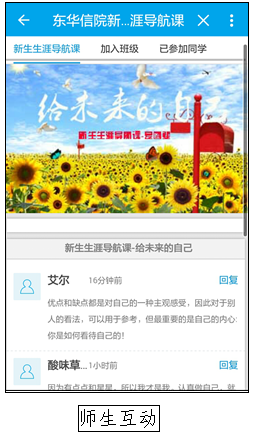 活动自开始以来得到同学们的大力支持,老师在课堂上与同学们共同互动,讲解生涯,指导学生,同学们课后在易班上积极留言,谈谈一节课下来的感悟和收获,老师通过这些留言了解大家的想法,从而更好地改进教学方式。例如在本期作业:写给自己未来的话中,同学们纷纷在易班轻应用平台上留言,写给未来的自己,夏菡斐老师希望这份作业可以永久保存,等到多年以后,学生们回头来看当年写的话,一定会有特别的感触。