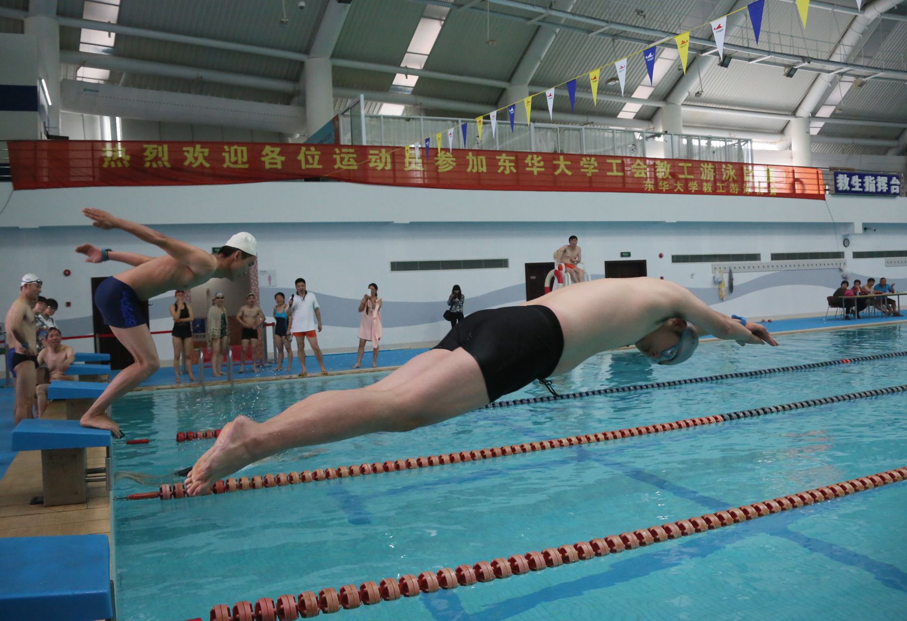 作为2015年教职工运动会的分赛场,本次比赛遵循推动全校群众性体育运动开展、促进学校精神文明建设、丰富教职工文化活动、增强教职工体质、促进学校游泳运动的普及提高及发展友谊的宗旨,设蛙泳、自由泳、4*40m混合接力等竞技项目,并增设救援沉底溺水者、混合泳姿捞物、双人救生球等趣味项目。比赛现场,各位参赛选手劈波斩浪,尽显身手。