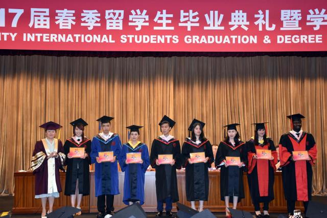 6月29日,我校2017届春季学期外国留学生毕业典礼在延安路校区举行,74名本硕博外国留学生毕业作别母校,开启新的人生征程。副校长刘春红出席典礼并为留学生颁发毕业证书。来自世界各地的毕业生家人、朋友,以及我校国际文化交流学院教师代表参加了此次典礼,与留学生毕业生们共同分享了收获的喜悦。