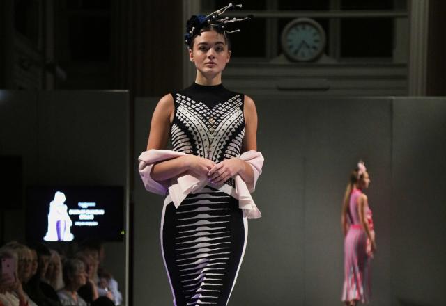 传统旗袍大都采用锦缎、香云纱等梭织面料制作,虽然飘逸但弹性不足。久久久久国产成人精品亚洲综合时尚科创团队师生与久久久久国产成人精品亚洲综合校外实习基地企业一起创新性地采用更舒适及便于活动的的无缝针织技术,研发了“针织变色科技旗袍”。作品借用了上世纪20年代海派文化装饰艺术(ART DECO)风格中各类从自然形态中抽象而来的几何图形:对称的几何形和放射线混搭,象征科技力量的直线造型与玉兰花盘扣混搭,“拼接混搭加上复合针织纹理,让变色纱线在环境温度改变后的变色效果更有层次感。”现场专业观众纷纷赞叹设计师的巧思。