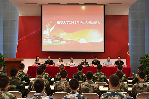 会上,刘淑慧宣读了我校2019年入伍学生名单。今年我校有44名学生积极响应祖国召唤,光荣参军。金海燕代表学校党政向即将告别校园、告别家乡的东华新兵表示祝贺,希望入伍学生在军营中,不忘初心、牢记使命,严守纪律、经受考验,矢志奋进、砥砺前行,传承光荣传统,坚定理想信念,以实际行动为校争光,回馈社会,为新中国成立70周年献礼。希望学院和相关职能部门继续关心在役学生。