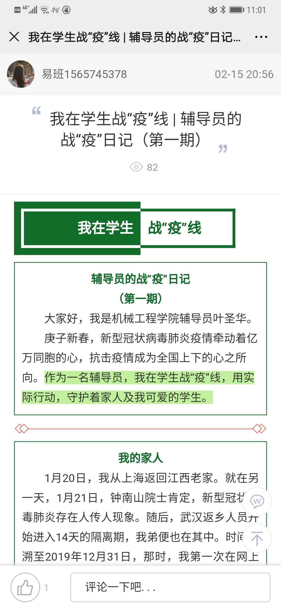 “面对疫情,虽然不能像医护人员那样,在战疫一线与病毒作斗争,但我可以通过自己的方式守护我的学生。”机械学院辅导员叶圣华在战“疫”日记中深情写到。为了更有针对性地做好疫情防控期间学生的思想政治工作,她给学生安排了一项作业:将在家的日程安排和情绪感悟写出来。“一路上小心翼翼,不敢坐公共座位,不敢到人多的地方去”“每天起床第一件事,就是摸摸额头,害怕自己感染上病毒”“妈妈是医生,她一个人在老家医院里上班,疫情扩散时还是很担心她。”看到学生的焦虑与担忧,叶老师在日记中告诉学生“新型冠状病毒疫情面前,作为大学生,一定要努力学习科学知识,将来为国家做贡献,祝愿疫情早日结束”“我们一起,一定能打赢这场防疫攻坚战”。