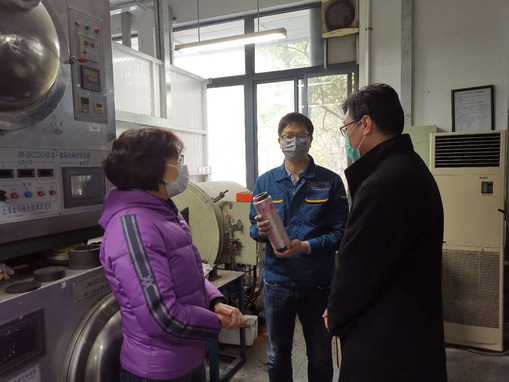 (在纺织学院考察口罩、防护服等防疫用品研发)
