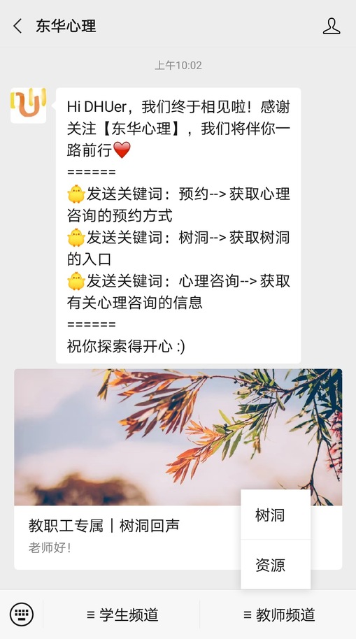 3. 关注微信公众号“东华心理”(dhuxinli),进入“教师频道”,点击“树洞”,则可查看进入树洞的方式。