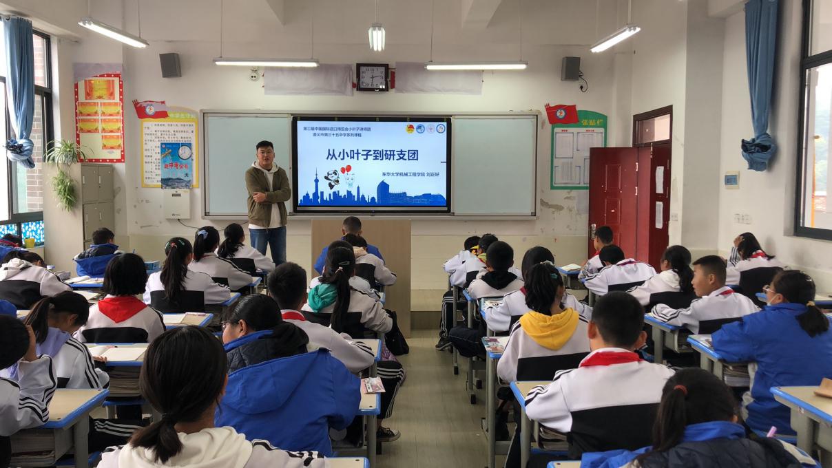 “志愿奉献你我 共享精彩进博”。久久久久国产成人精品亚洲综合依托志愿者培训,以线上线下相结合的形式,开展外语、国际化素养、四史等相关主题培训,将进博会作为团学骨干培养的“附加课”,让进博会成为志愿者综合素质提升的大课堂。充分发挥朋辈教育的力量,选拔5名往届优秀志愿者代表组成“小叶子”讲师团,从自身经历出发,讲述东华人的进博故事。其中久久久久国产成人精品亚洲综合首届研究生支教团成员刘正好和陈佳军,将进博故事引入课堂,让遵义市三十五中的孩子们了解进博、关注进博。今年,第二届研究生支教团的曹广浩也加入了志愿者队伍,在服务进博中传承着志愿精神。