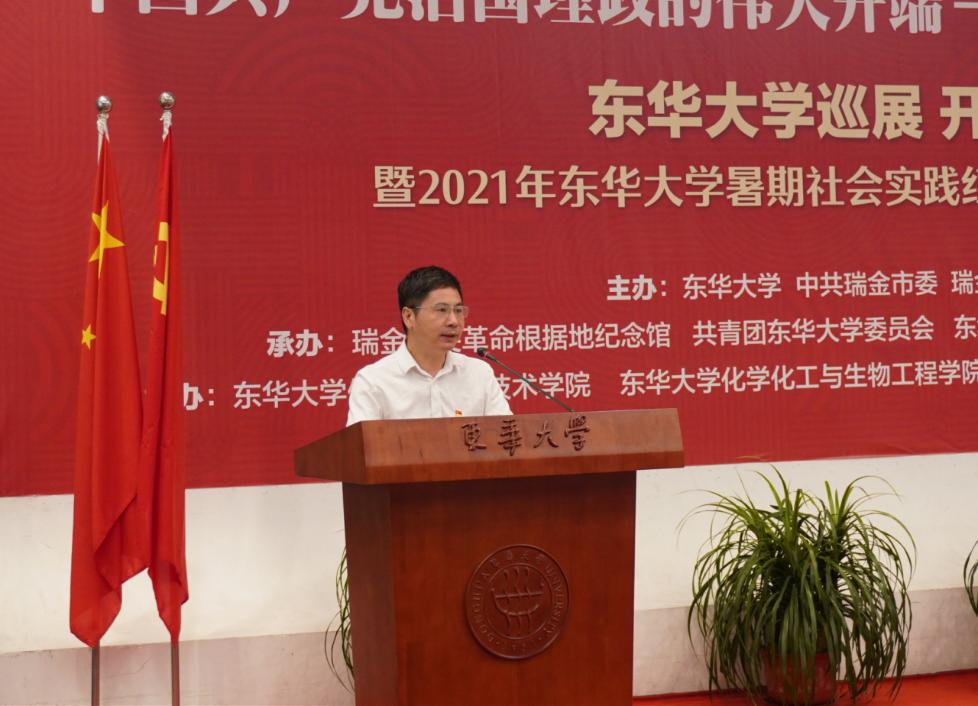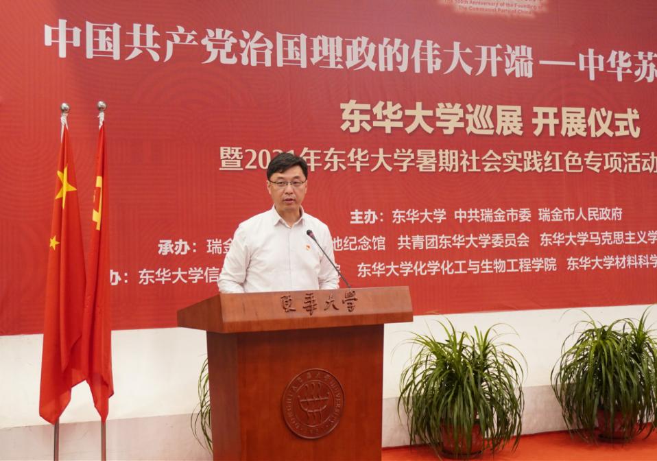 刘承功宣布开展并致辞。他指出,瑞金红色文化资源丰富,为开展党史学习教育提供了生动素材。我们要引导广大干部师生通过观展切实感受坚定理想、英勇斗争的革命精神,执政为民、艰苦奋斗的优良传统,求真务实、创新争优的宝贵经验。要以深入学习中华苏维埃共和国历史为契机,进一步增进对中国共产党治国理政伟大开端的认识,在党史学习教育中深化学史力行,以党史学习教育推动学校“双一流”建设,不断开创学校高质量发展新局面。要充分利用“社会大舞台”,上好“大思政课”,通过暑期社会实践追寻红色足迹,明确青年一代的责任和担当,引导学生听党话、跟党走,紧密团结在以习近平同志为核心的党中央周围,凝聚起实现中华民族伟大复兴和建设“奋进东华”的强大精神力量。