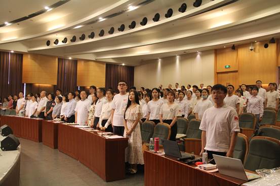 丁霞萍带领29位新党员在党旗下郑重宣誓,全体师生党员重温入党誓词,号召全体师生党员永葆政治本色、永葆革命和奋斗精神,牢记为人民服务的初心使命。