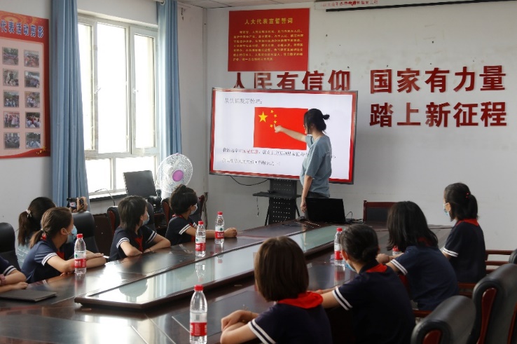 (实践团成员向荒地乡学生介绍五星红旗背后的故事)